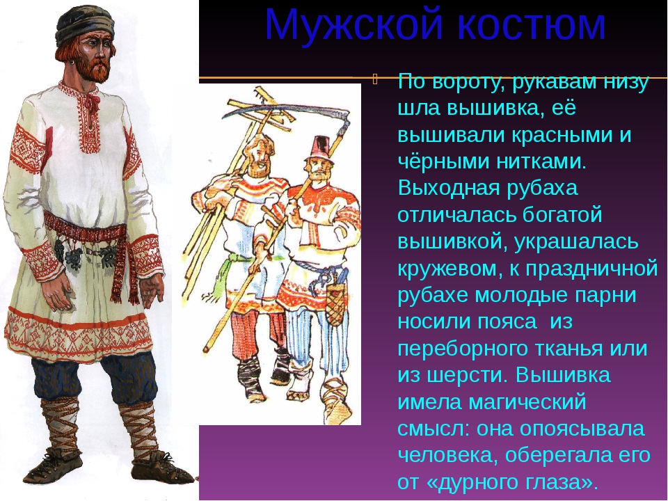 2 | Женская и мужская одежда из холста свободного покроя, характерна для славян в качестве основной исподней и одновременно выходной одежды богато украшена яркой вышивкой или узорными вставкам. |