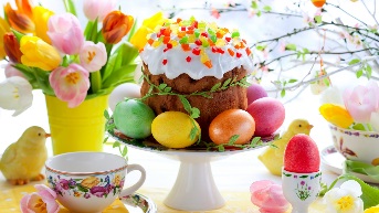 (Пасха) | 9.Праздник считается светлым днём всеобщего равенства, прощения и доброты. В этот день принято готовить стандартные для этого праздника угощения. Куличи и пасхи традиционно пекут русские женщины, хозяйки дома, а яйца раскрашивают молодые члены семьи (молодёжь, дети). Непосредственно в этот день принято говорить при встрече со знакомыми «Христос Воскресе». Услышавшие данное приветствие нужно отвечать на него «Воистину Воскресе». После обмена традиционными фразами следует троекратный поцелуй и обмен праздничными угощениями (куличами, пасхами, яйцами). |