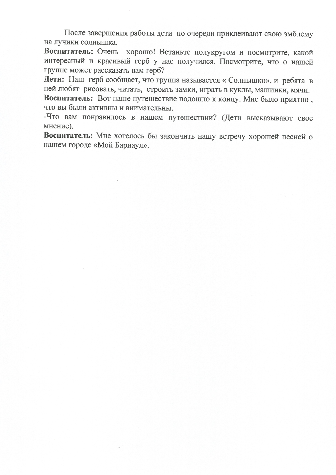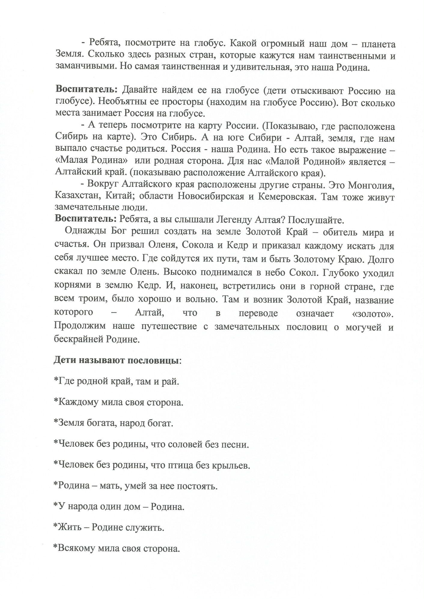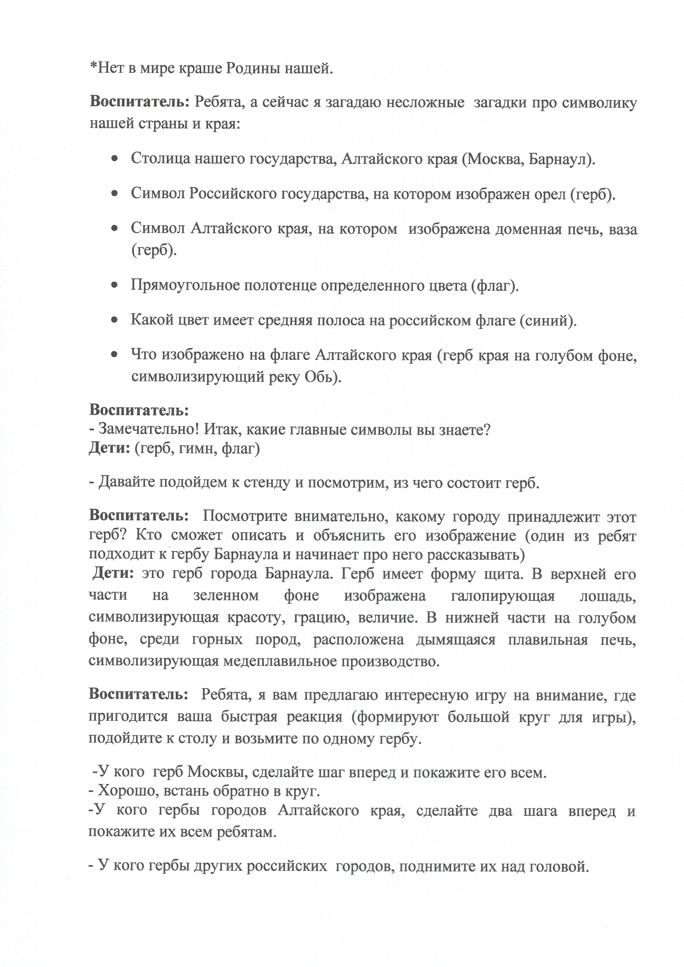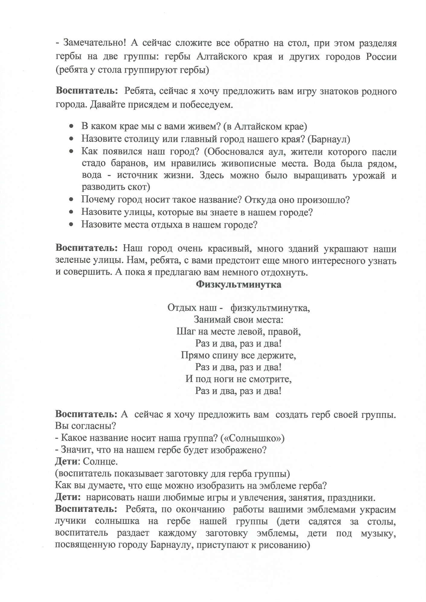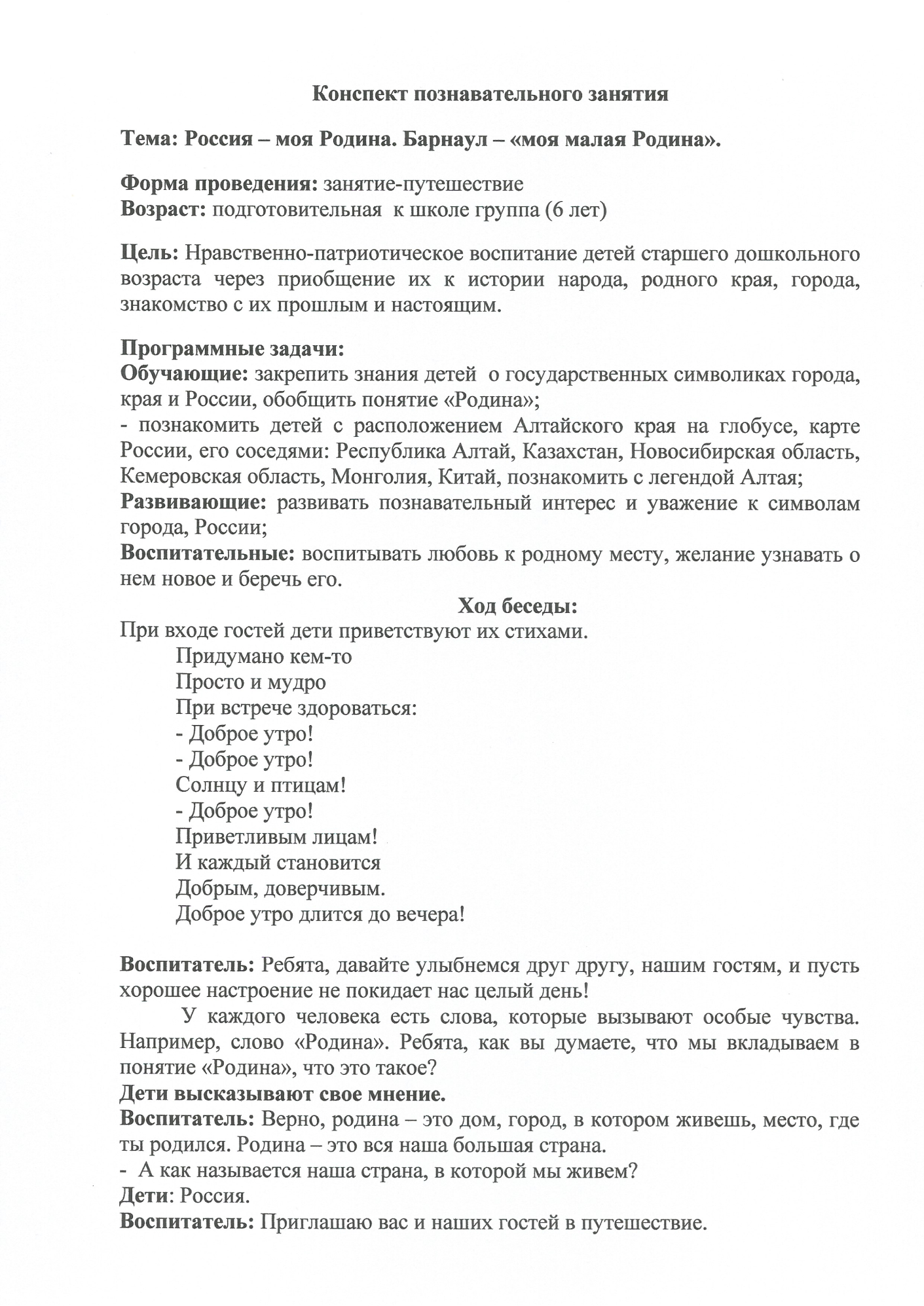 29.05.2024 Конспект позновательного занятия по теме:Россия-моя Родина.Барнаул-"моя малая Родина". Принять участие в этом конкурсе Описание конкурса Список всех конкурсов Колесникова Ирина Васильевна МБДОУ "Детский сад №21"общеразвивающего вида,г.Барнаул Конкурсная работа Свидетельство участника экспертного совета жюри Свидетельство можно заказать сразу, как Вы оставите не менее 3 объективных комментариев в этом разделе сайта. Узнать подробнее ИНТЕРАКТИВНОЕ ЗАНЯТИЕ ПО ПРИОБЩЕНИЮ ДЕТЕЙ К РУССКОЙ НАРОДНОЙ КУЛЬТУРЕ, ТЕМА: "ПРОЩАНИЕ С ИЗБОЙ" Консультация для воспитателей по теме:"Взаимодействие педагогов ДОУ по воспитанию у детей дошкольного возраста любви к родному краю,городу" У вас недостаточно прав для добавления комментариев.Чтобы оставлять комментарии, вам необходимо авторизоваться на сайте. Если у вас еще нет учетной записи на нашем сайте, предлагаем зарегистрироваться. Это займет не более 5 минут.