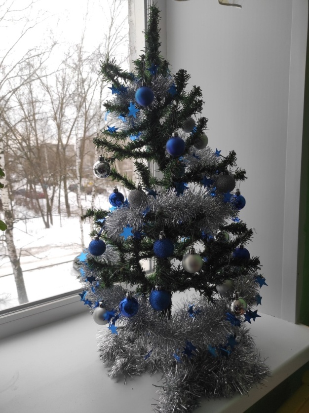 Для новогоднего интерьера традиционно используют цвета зимнего леса-зелёный, белый, синий, голубой. Именно этот дизайн мы решили выбрать для украшения наших групповых помещений.