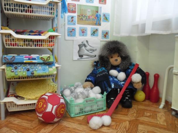 В уголок двигательной активности мы поместили мягкие снежки. Теперь можно весело играть в групповой комнате, перебрасывать снежки друг другу, метать их в цель или организовать весёлую эстафету с клюшками. Так же имеются журналы и иллюстрации с изображением зимних игр-забав, подвижных игр, зимнего спорта.
