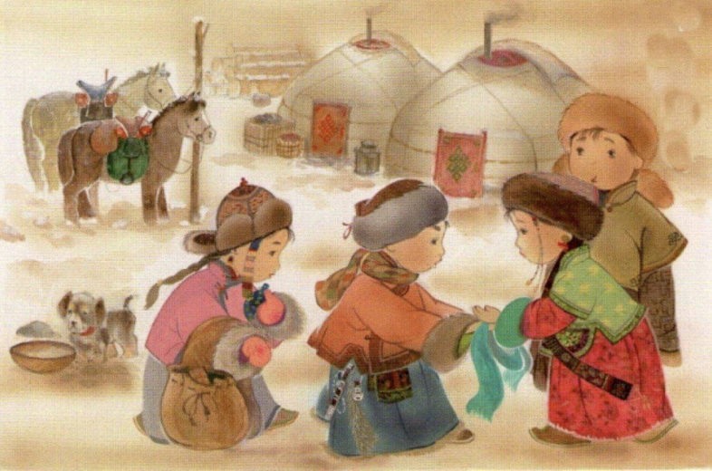 ЗИМА: у бурятов Новый Год называется «Сагаалган». Дома буряты накрывали праздничный стол, на котором обязательно присутствовала «белая пища»: молоко, сметана, творог. В первый день праздника нельзя ходить по гостям, нужно провести его в кругу семьи, а хождение к родственникам начиналось на второй день праздника и продолжалось до самого конца. Проводился Гутор-обряд очищения, во время которого из дома человека выбрасывается и уходит всё плохое, все неудачи, накопившиеся за год. После окончания праздничной трапезы в большую чашу собираются остатки со стола, так же в неё помещают куклу, вылепленную из теста. Всё это служит «выкупом», чтобы злые духи не беспокоили хозяйский дом. На рассвете люди берут чашу и отправляясь к большой дороге, опустошают её со словами: «Прочь отсюда!», после чего возвращаются домой не оглядываясь назад. В праздничные дни зимы совершался обряд Коней ветра Удачи. Изображение коня помещали на крышу дома таким образом, чтобы сам конь развивался на ветру, унося с собой болезни и несчастья.
