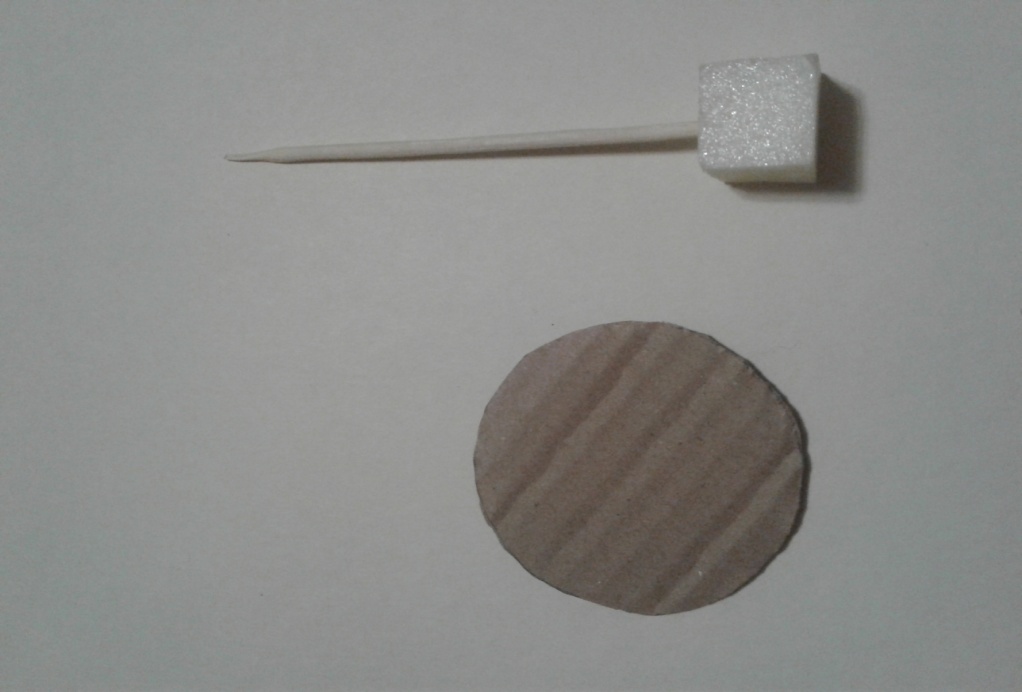 1.готовим основу для ёлочки - на картонный кружок приклеиваем квадратик из пенопласта и вставляем в него шпажку, высота шпажки зависит от высоты ёлочки;