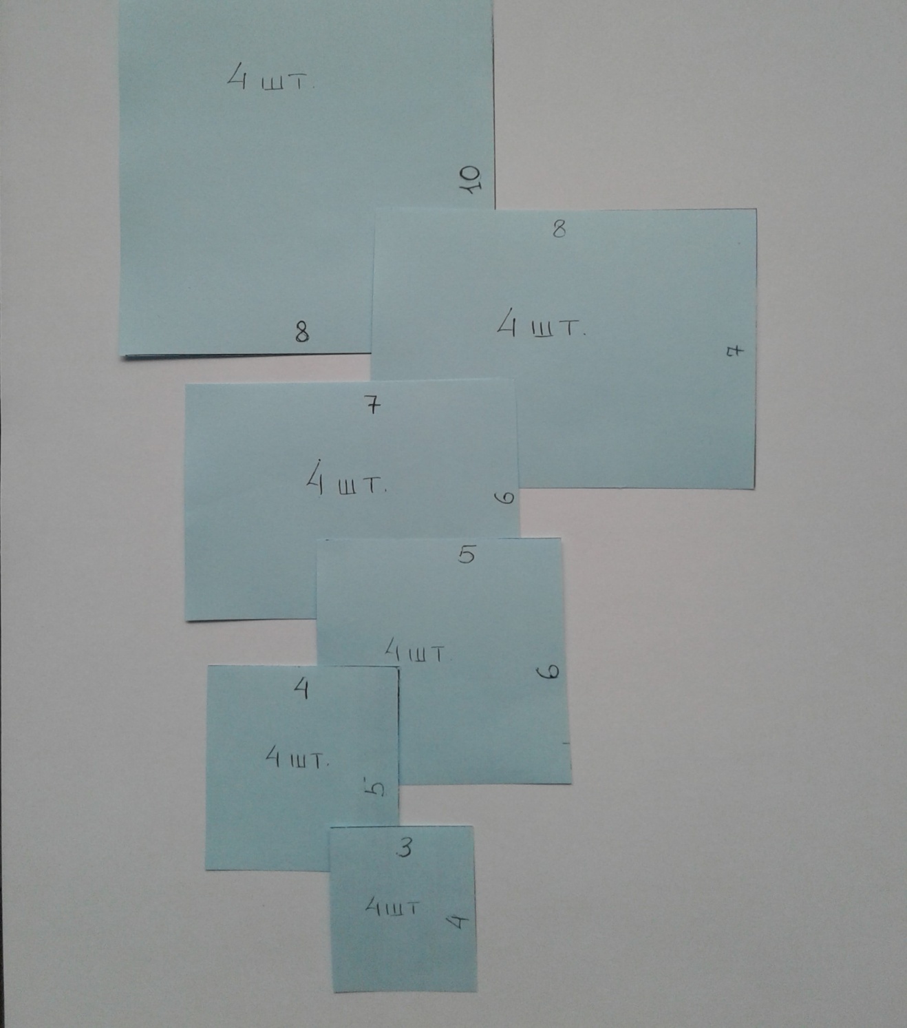 Вырезаем из бумаги прямоугольники: 10х8 – 4 шт.,8х7 – 4 шт., 7х6 -4 шт., 6х5 -4 шт., 5х4 – 4 шт., 4х3-4 шт.