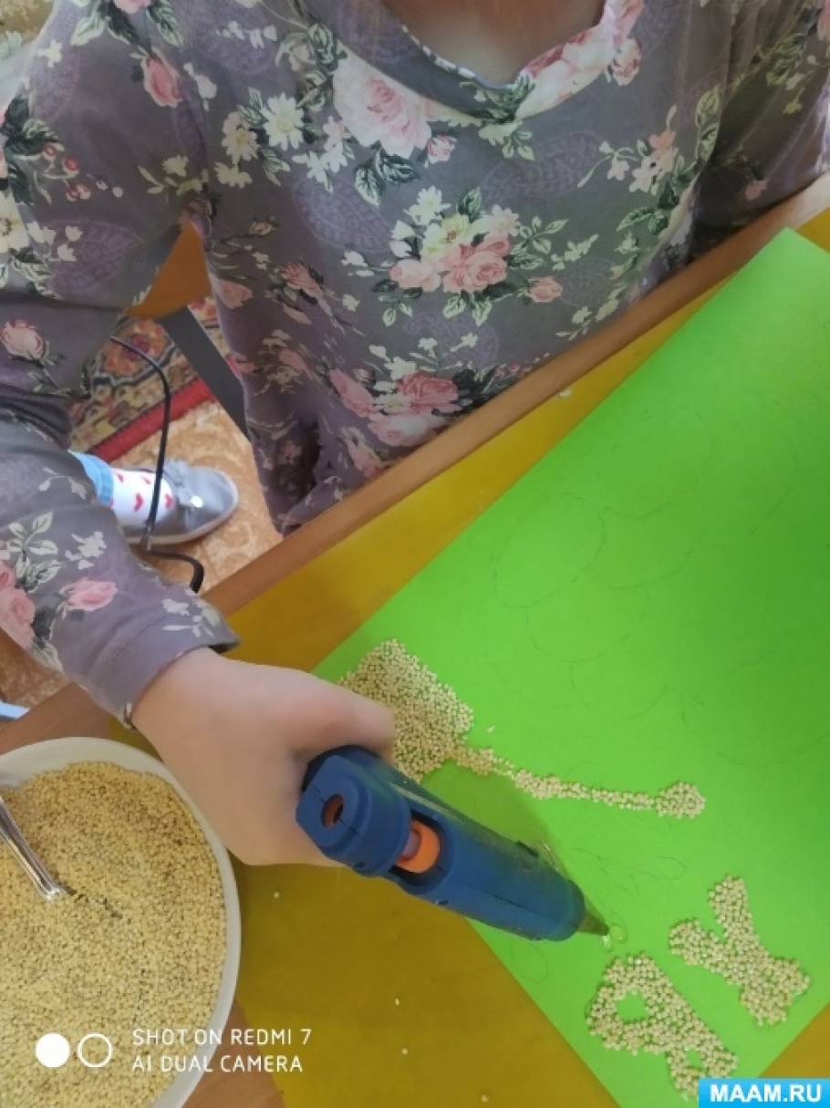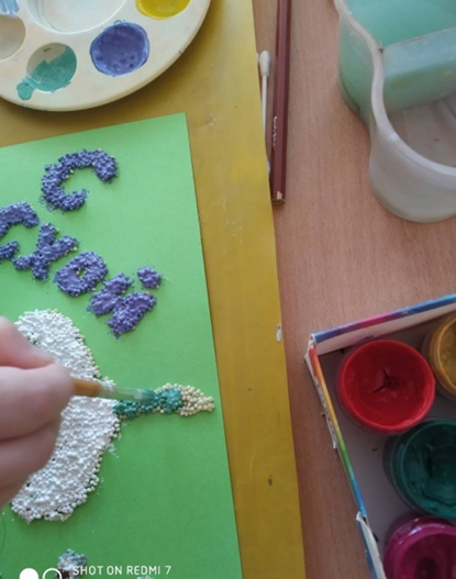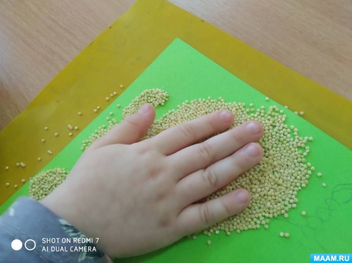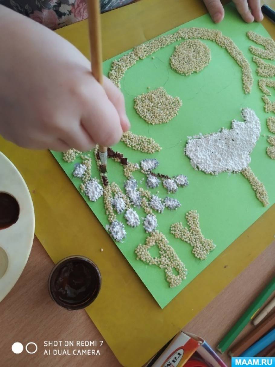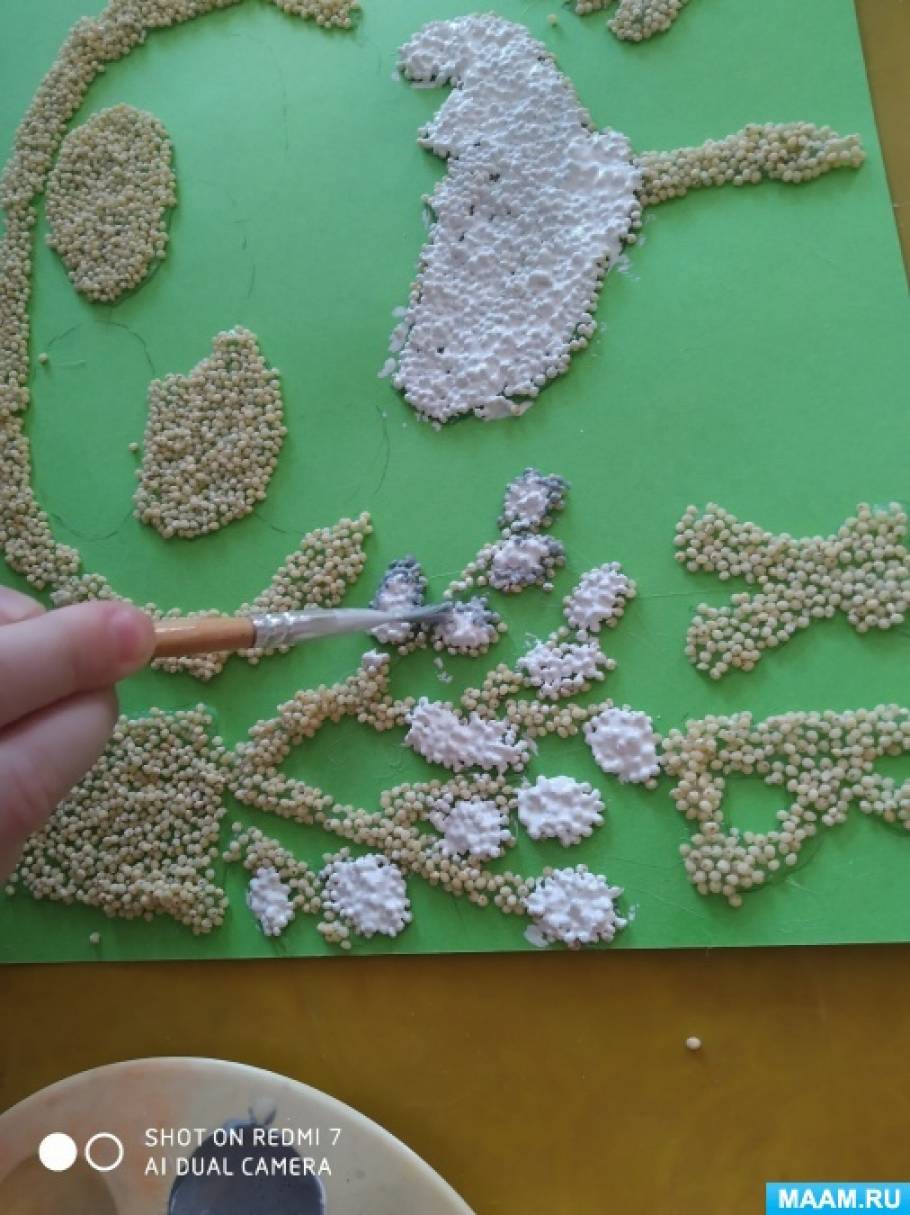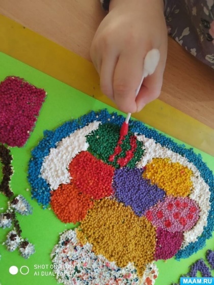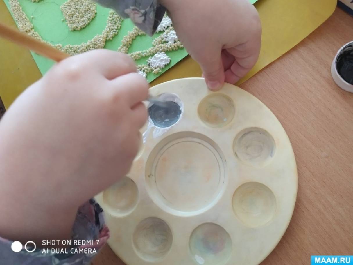 3. На этом этапе постепенно раскрашиваем части рисунка, заполненные пшеном, при этом вызывать у ребенка желание пользоваться не готовыми цветами красок из набора, а создавать их оттенки. Раскрашивать удобно тычками, а кистью докрашивать края форм.
