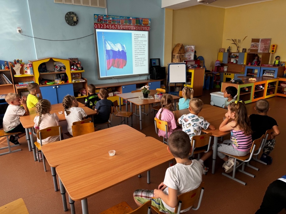 Воспитатель: Молодцы. Давайте с вами рассмотрим наш флаг. Посмотрите, как он выглядит.