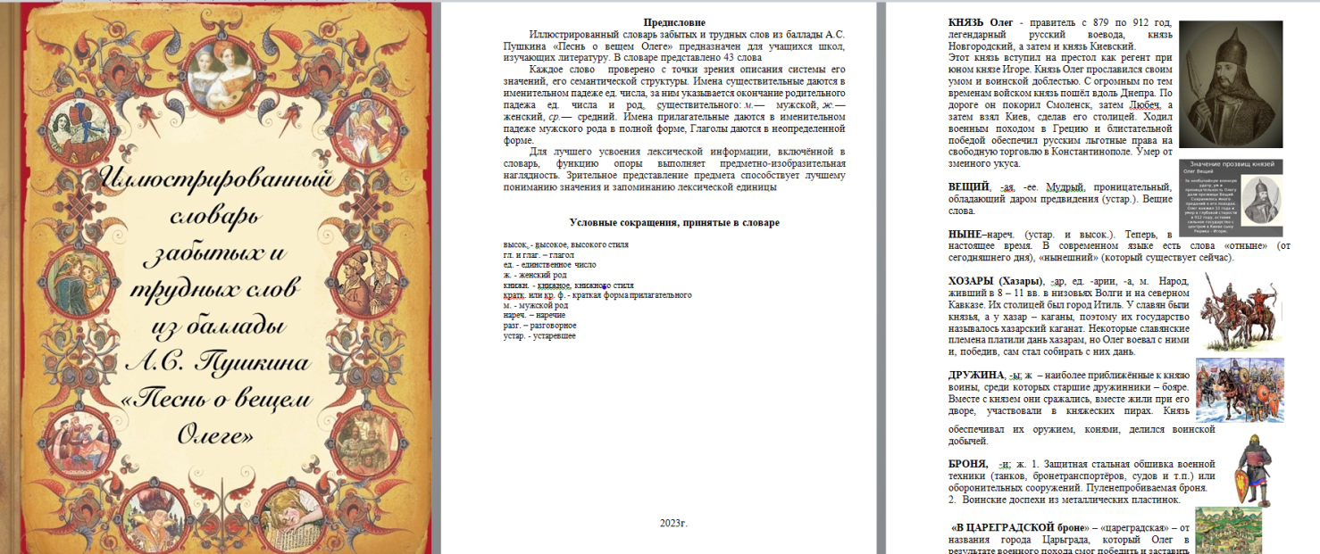 Вывод, который можно сделать после анализа исторических событий, представленных в учебнике истории: Князь, время правления которого с 789 по 912г.г., смог заработать репутацию искусного полководца, мудрого правителя и защитника Руси. Какие устаревшие слова помогают воссоздать эпоху правления князя? Во время словарной работы на уроке возможно использование «Иллюстрированного словаря забытых и трудных слов из баллады А.С. Пушкина «Песнь о вещем Олеге» - проектная работа, созданная ранее учащимися класса. (Приложение 2) | ||||||||||||||||||