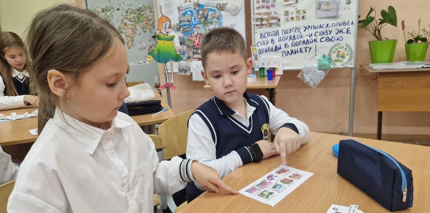 Один человек работает со стендом (располагает карточки в правильной последовательности. Остальные работают парами на местах. После выполнения проверяем и комментируем.)