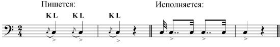 Для исполнения форшлага из одной ноты надо держать палку в левой руке на расстоянии примерно 2 см от кожи барабана; конец правой палки − на расстоянии 8 см от кожи.