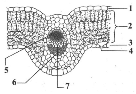 1 балл | Поперечный срез листа липы 1. кожица 2. зеленые клетки 3. воздухоносная полость 4. устьице 5. сосуды 6. волокна 7. ситовидные трубки 7 баллов |