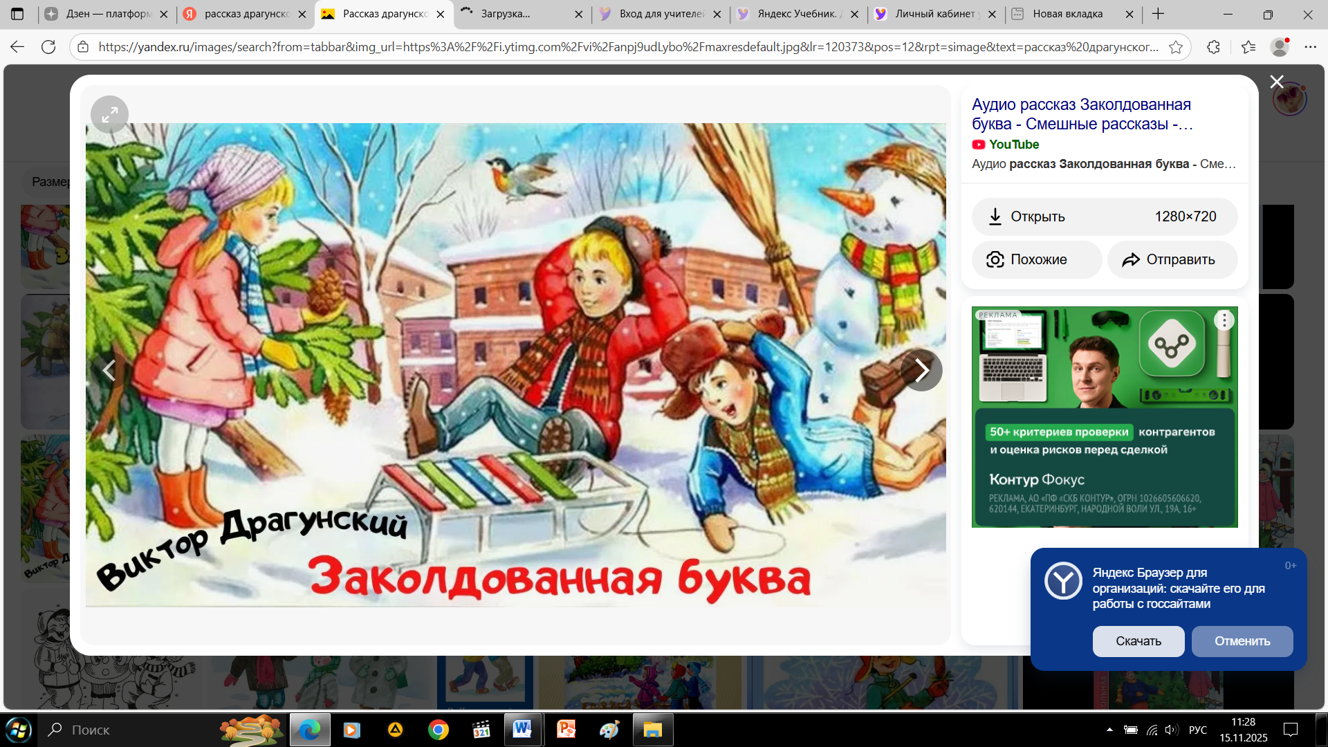 -Я сейчас познакомлю вас с отрывком из рассказа Драгунского «Заколдованная буква». Внимательно слушайте и смотрите.
