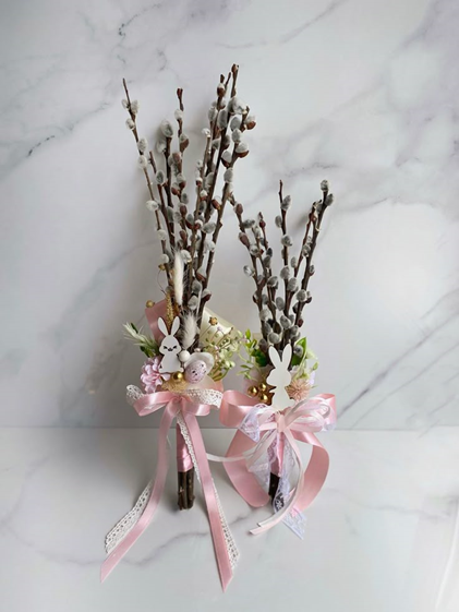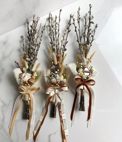 Для декора букета из вербы (например, пасхального букета) можно использовать разные элементы: цветы, ленты, яйца или перья. Выбор декора зависит от стиля композиции и может быть связан с пасхальной тематикой. | ||||