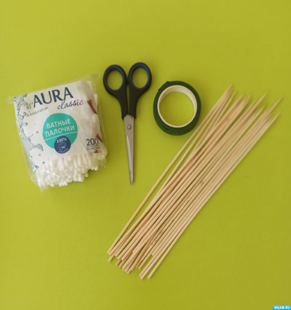 II - Подготовка к мастер-классу: Убедитесь в наличии всех материалов: Проверьте, чтобы у каждого участника было достаточно ватных палочек, проволоки или шпажек, ножниц и тейп-ленты. Создайте атмосферу: Поместите материалы на столах и подготовьте место для работы, чтобы участники могли удобно садиться и работать. Ход мастер-класса:1 этап: Приготовить на рабочей поверхности необходимые материалы материал.