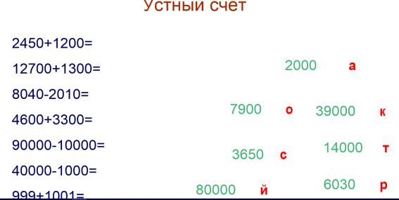 II. Мотивация и определение темы урока. 1) Устный счёт. | -Нашу работу начнём с устного счёта. На доске интерактивное задание с примерами, решите их. 2450+1200 12 700+1 300 8040-2010 46 000+3 300 90 000-10 000 40 000- 1000 999+ 1 001 -Какое слово у нас получилось? -Сегодня мы будем строить дом. | Считают устно примеры Составляют из букв слово. Стройка | Регулятивные УУД: осуществлять контроль результатов ранее полученных знаний, уметь оценивать правильность выполнения действий |