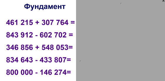 IV. Основная часть. 1) Повторение (сложение и вычитание многозначных чисел базового уровня). | -Для постройки дома нам нужен фундамент, стены, крыша, окна и дверь. -Чтобы заложить прочный и надежный фундамент, выполним задание 1. -На карточках записаны примеры, но в строчку. Вы должны их записать столбиком и решить. 461 215+ 307 764 843 912-602 702 346 856+548 053 834 643- 433 807 800 000-146 274 | Решают примеры базового уровня. | Предметные УУД: выполнять операции сложения и вычитания с многозначными числами, в разряде которых присутствуют нули; выполнять операции сложения и вычитания с многозначными числами. |