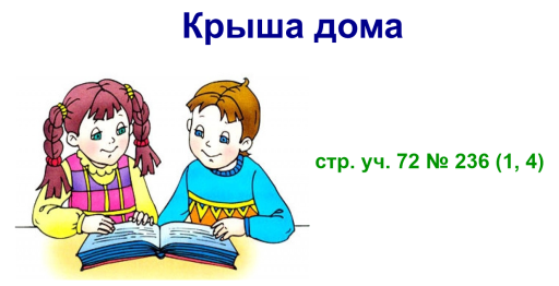 6) Работа в парах (решение уравнений) | -Возвели стены нашего дома. Теперь впереди нас ждет крыша. - Как вы думаете, что труднее возводить стены или крышу? Поэтому вам тоже придётся не так-то легко с крышей нашего дома. Выполнив № 236 на стр. 72 учебника, вы построите крышу. -Для того чтобы решить уравнения без ошибок, нам нужно вспомнить названия компонентов при сложении и вычитании и как эти компоненты связаны между собой. - Построим нашу мудреную крышу. | Отвечают на вопросы Работают в парах. Строят крышу на интерактивной доске