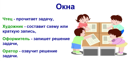 7 ) Групповая работа | -Наш дом под синей крышей. Но в доме темно, не проникает свет, не может он попасть внутрь, потому что нет ни окон, ни дверей. Окна и двери мы будем вставлять группами по 4 человека. В каждой группе у каждого будет своя роль: чтец, художник, оформитель и оратор. Чтец - читает задачу Художник - составляет схему или краткую запись Оформитель - записывает решение задачи Оратор - озвучивает решение задачи. -Распределите, пожалуйста, роли в группе. Задачи 1)Сорное растение василек дает 6680 семян в год, а полевой осот на 12 920 больше, чем василек. Сколько семян в год дают вместе эти растения? 2)У Вани в коллекции 1 2 973 марки, а у его брата Саши на 1482 марки меньше. Сколько марок у Саши и у Вани вместе? | Распределяют в группе роли.