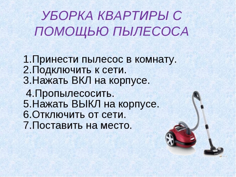 Тема: Соблюдение последовательности действий при уборке пылесосом.
