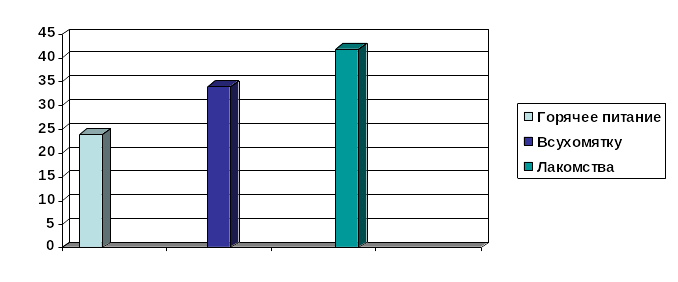 Чтение и обсуждение записанного показывает, какой пище ребята отдают предпочтение. 24% детей выбрали горячее питание, 34%- предпочитают есть всухомятку, 42 % - любят лакомства.
