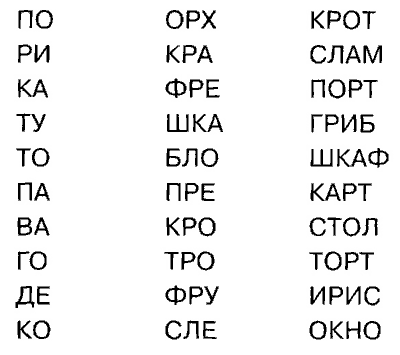 Примерный список слов: окно, стул, ромашка, ириска, просо, плечо, шкаф, василёк, книга и т. д.