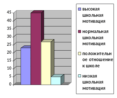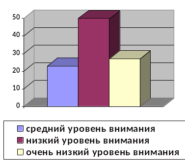 В сентябре при исследовании учащихся своего класса (анкетирование для оценки уровня школьной мотивации и тест Пьерона-Рузера на внимание), обнаружила, что у 23% уч-ся высокая школьная мотивация, у 45% уч-ся нормальная школьная мотивация, у 27% уч-ся положительное отношение к школе, но школа привлекает больше внеучебными сторонами и у 5% уч-ся низкая школьная мотивация. Уровень концентрации внимания у уч-ся был следующим: средний – 23%, низкий – 50%, очень низкий – 27%.