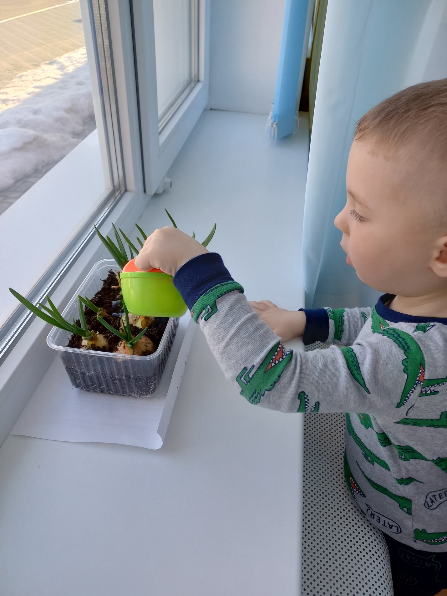 - Вот теперь мы будем ухаживать за луком поливать его.