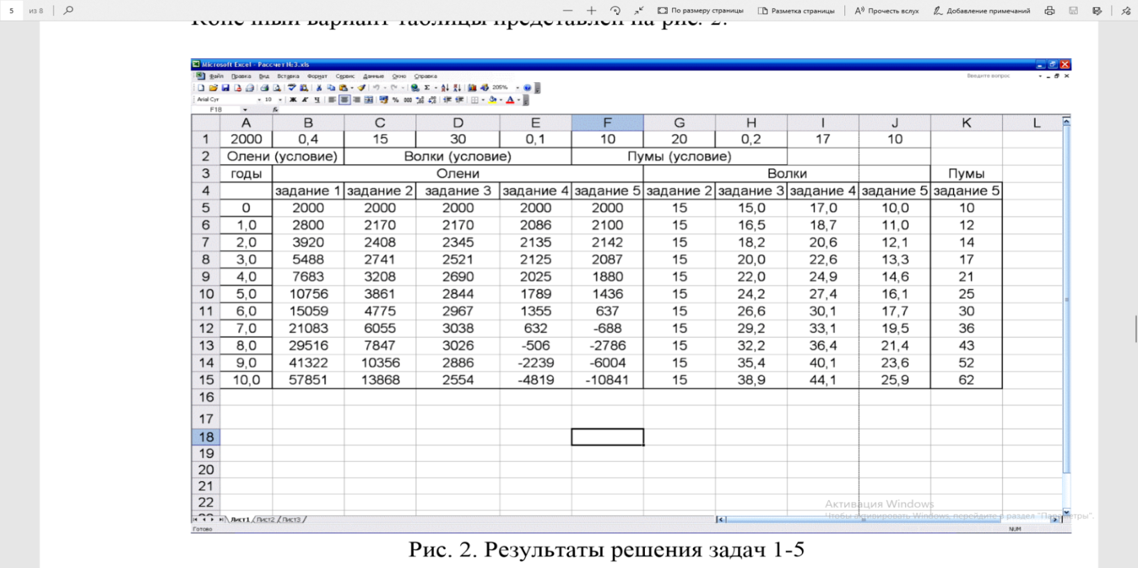 1. Численность оленей вычисляется в ячейках Е5:Е 15, численность волков - в ячейкахI5:I15.
