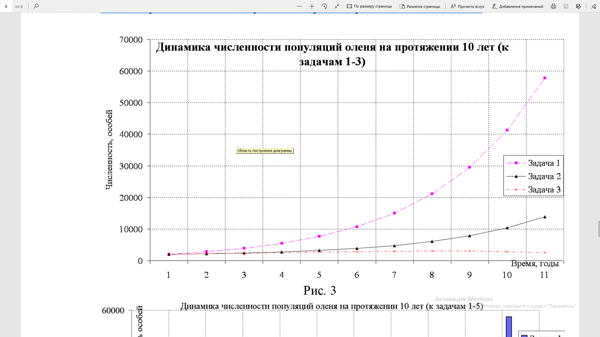 Задача 3. Определите численность оленей через 1, 3, 5 и 10 лет, если численность популяции волков составляет 15 особей и каждый год прирост составляет 10 %. Покажите графически, как изменяется численность оленей в течение данного периода.