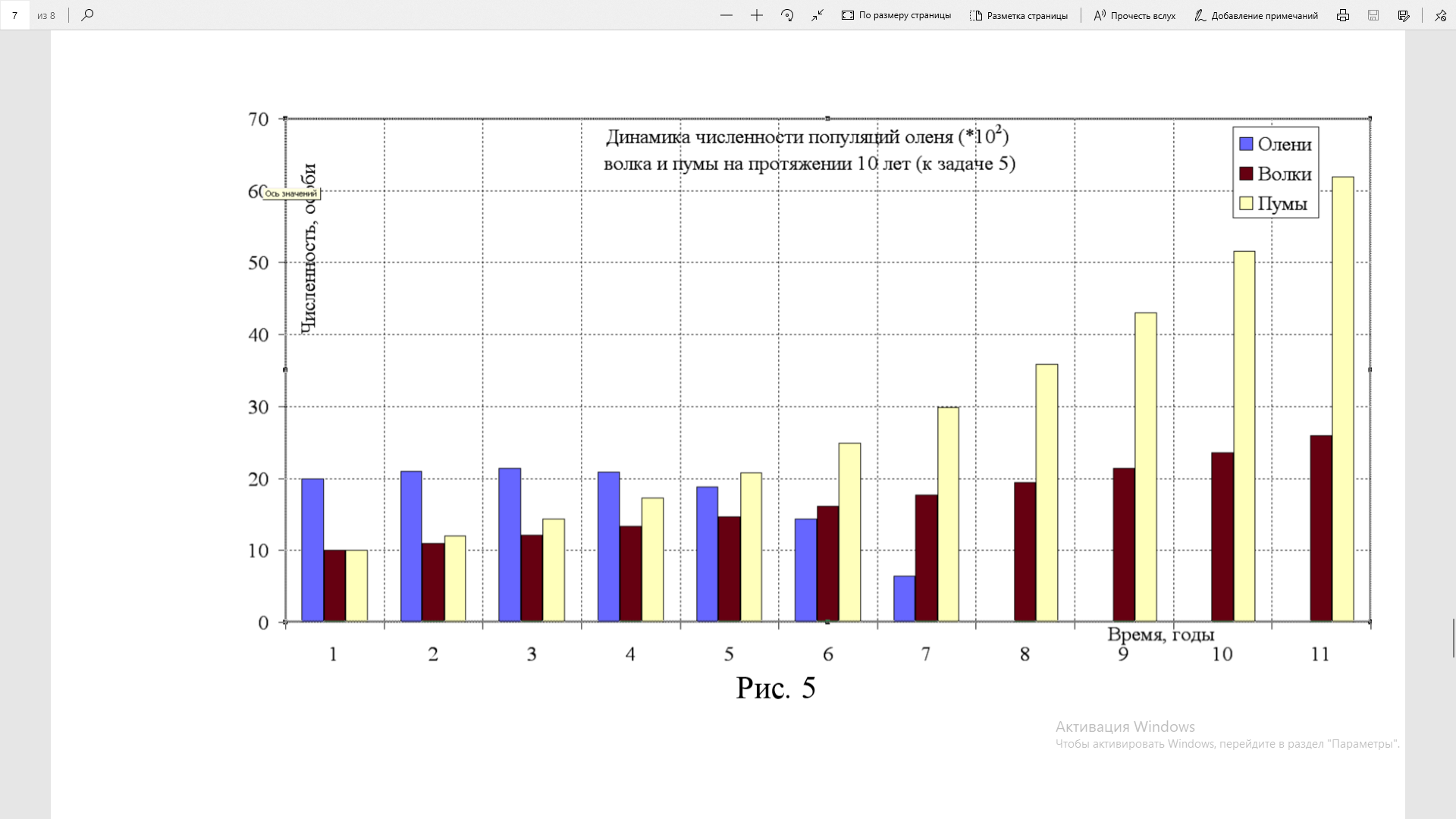 Про численность оленей в задаче говорится пять раз (в задачах 1-5), про численность волков четыре раза (в задачах 2-5), численность пумы упоминается 1 раз (в задаче 5).