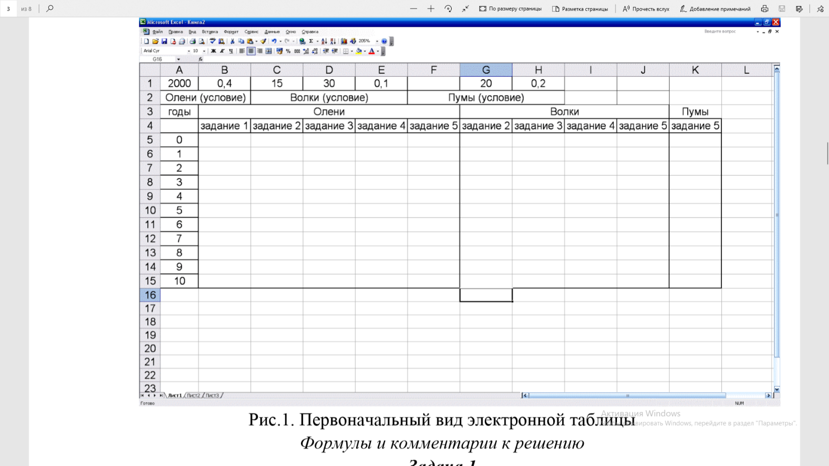 Первую строку таблицы заполните константами: в ячейку А1  первоначальная численность оленей, в ячейку В1  ежегодное увеличение популяции оленей, в ячейку С1  первоначальную численность волков, в ячейку D1  количество оленей, которое съедает 1 волк в год, в ячейку El  годовой прирост численности волков, ячейку F1 оставляем незаполненной, при решении 5 задачи подберем начальную численность пум, в ячейку G1 записываем количество оленей, которое съедает одна пумой в год, в ячейку HI - годовой прирост популяции пумы (см. рис. 1).