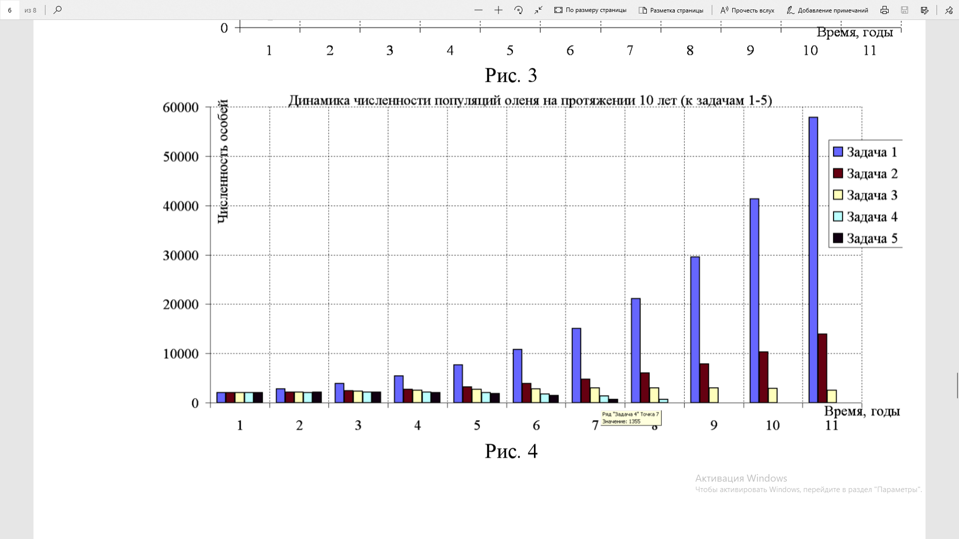 Задача 3. Определите численность оленей через 1, 3, 5 и 10 лет, если численность популяции волков составляет 15 особей и каждый год прирост составляет 10 %. Покажите графически, как изменяется численность оленей в течение данного периода.