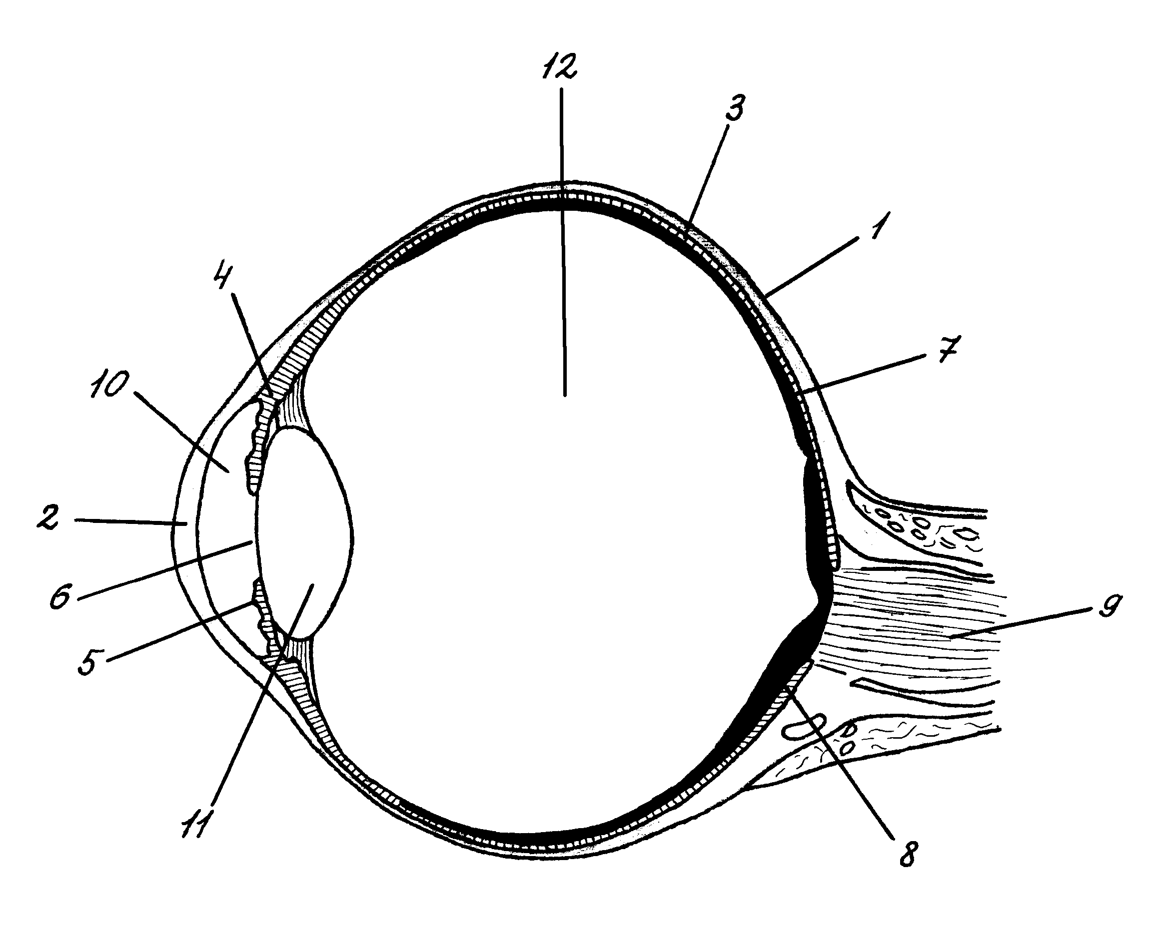 Рассмотрите рисунок, изображающий строение глаза человека. Напишите название его частей, обозначенных цифрами и заболеваний из списка диагнозов Евгения, связвнных с той или иной частью глаза.