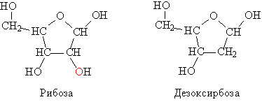 У второго соединения нет группы ОН (окси-группа), которая в рибозе отмечена красным цветом. В связи с этим втрое соединение называют дезоксирибозой, т.е., рибоза, лишенная окси-группы.