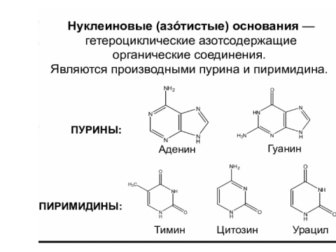 Пурин – азотистое основание, конденсированное азотсодержащее гетероциклическое соединение, состоит из шести- и пятичленного циклов, содержит четыре атома азота. Производные пурина входят в состав нуклеотидов, из которых состоят нуклеиновые кислоты