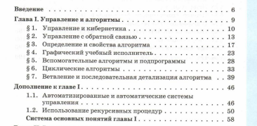 2. В линейке И.Г. Семакина основы алгоритмизации изучаются в разделе «Управление и алгоритмы», который рассчитан в 9 классе на 10 ч. В учебнике к теме алгоритмизации применен подход на основе кибернетики, в частности с помощью прямых и обратных связей. Данный раздел начинается с изучения таких определений, как управление, алгоритмы управления, обратная связь. Далее учащиеся переходят к понятию алгоритма, свойствам и видам алгоритма.