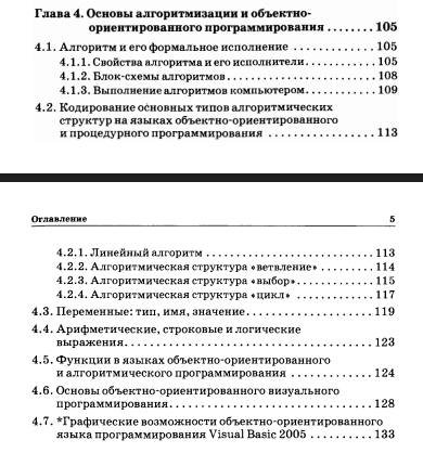 3. В учебнике Н.Д. Угриновича алгоритмизация рассмотрена в четвертой главе «Основы алгоритмизации и объектно-ориентированного программирования» 9 класса (14. ч.). Определение и свойства алгоритма описываются в параграфе 4.1. Учебные среды (исполнители) для освоения алгоритмизации не применяются. Об алгоритмических структурах и структурах данных рассказывается параллельно с описанием программирования на языке Visual Basic. В конце каждого параграфа записаны контрольные вопросы и задания для самостоятельного выполнения.