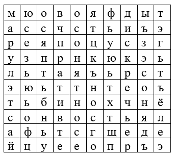 Все поле заполнено буквами. Каждая буква может входить в состав только одного слова. Слова в этом кроссворде не пересекаются, могут изгибаться, но только под прямым углом (по диагонали слова не располагаются), то есть не могут иметь общих букв. Слова должны только соприкасаться друг с другом.
