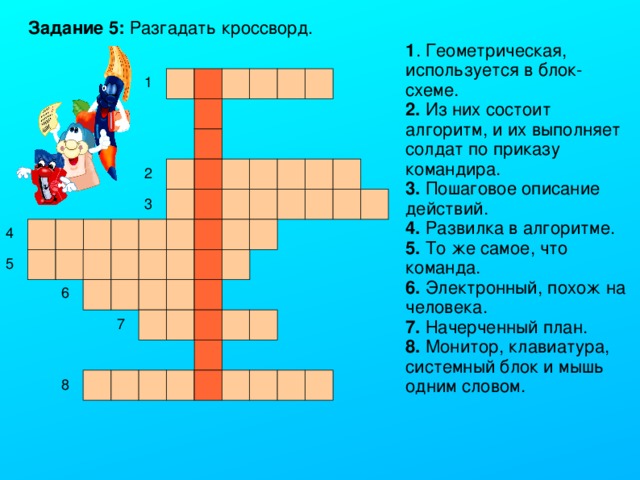 Задание представляет собой чайнворд по темам главы «Основы алгоритмизации». Необходимо решить задачи и написать полученные числа по часовой стрелке. В каждую ячейку записывается одна цифра. Последняя цифра полученного числа является первой цифрой следующего. За каждую решенную задачу ставится 2 балла. Всего можно набрать 20 баллов.