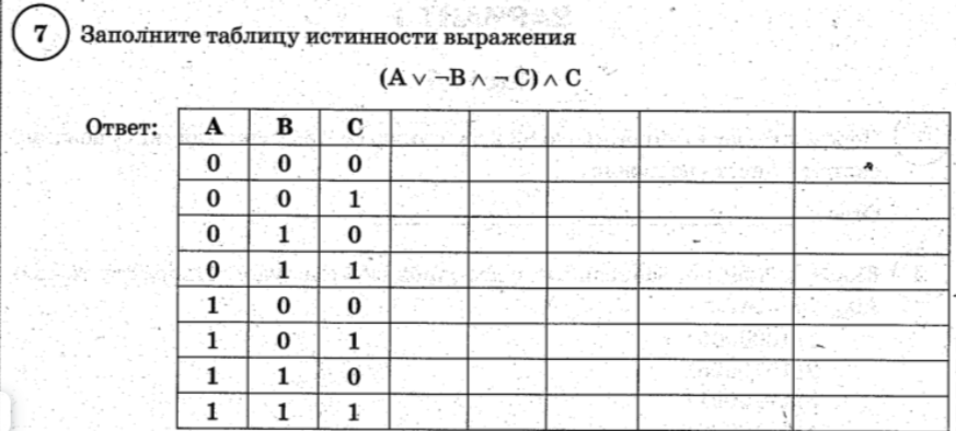 А | В | С | A & С | ¬ С | В&¬ С | ¬ (В&¬ С) | (A & С) v ¬ (В&¬ С) |