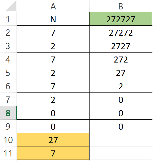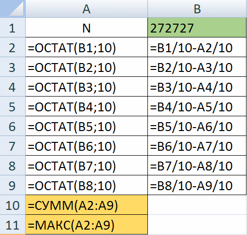 Кеа очень любит математику, числа и формулы. Однажды он увидел, как его старший друг Оло работает в приложении с таблицей, которая в автоматическом режиме считает значения по формулам. Кеа вспомнил, что однажды уже имел дело с таким приложением и создал таблицу для обработки натурального числа М. Вот эта таблица в режиме отображения формул и в режиме отображения значений.
