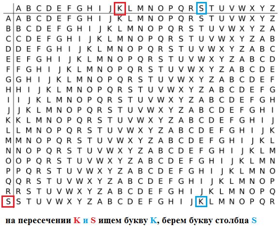 В исходном сообщении и ключе берем первые буквы. Буква исходного сообщения – это столбец таблицы, а буква ключа – это строка таблицы, на их пересечении находится буква шифрованного сообщения. Так в нашем примере для первых букв Sиs это буква K, для вторых букв – это буква O, для третьих букв – буква A, для четвертых букв (iи N) – это буква V, и т. д. Таким образом получим зашифрованное сообщениеkoavqkbvagfa.