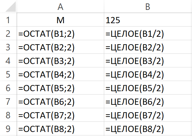 Знак «/» в формулах означает деление. Функция ОСТАТ(B1;2) возвращает остаток от деления числа, сохраненного в ячейке В1, на 2. Функция ЦЕЛОЕ(B1/2) округляет число до ближайшего меньшего целого.