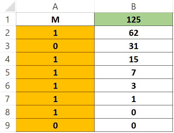 Кеа показал своему другу эту таблицу и попросил его найти такое наименьшее четное число M, которое нужно ввести в ячейку B1, чтобы в диапазоне ячеек А2:А9 оказалось ровно три единицы. Оло удивился, как Кеа хорошо ориентируется в формулах, но с легкостью нашел необходимое число. Что Оло сообщил Кеа?