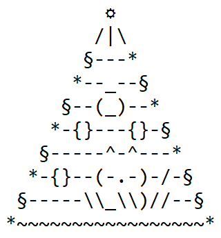 Выполните задание. Рассмотрите изображение елочки и создайте копию этого изображения в текстовом редактореБлокнот (или в любом другом текстовом редакторе). Используйте один из моноширинных шрифтов (Courier, Lucida Console, Consolas). Получившийся файл сохраните с именем Елочка.txt и загрузите на диск http://file.karelia.ru/. В качества ответа вставьте полученную ссылку на файл.