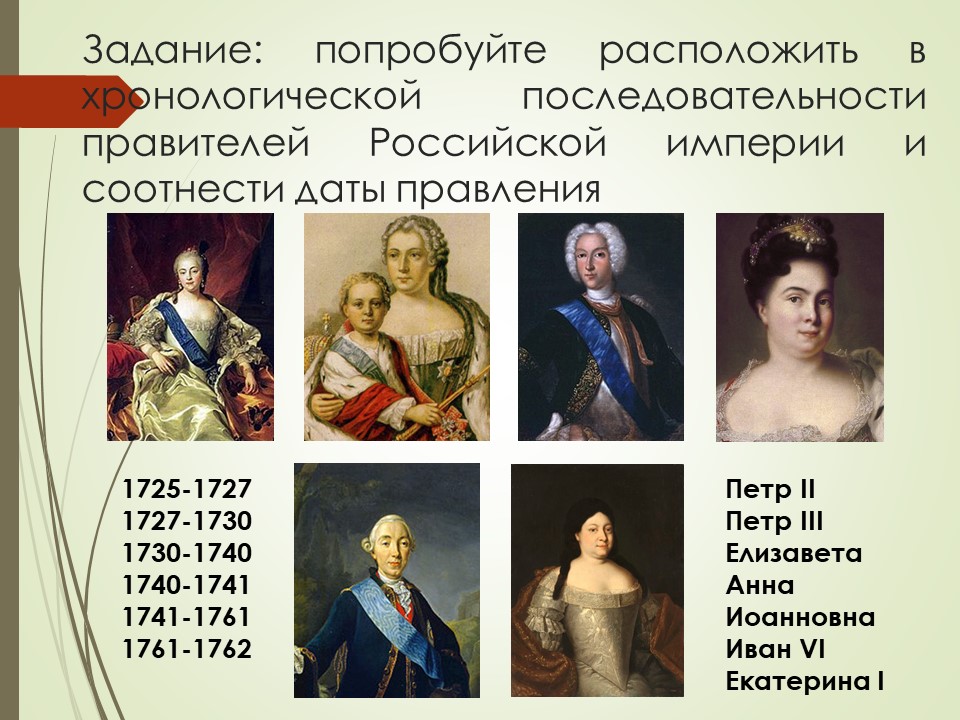 Годы правления | 1725-1727 | 1727-1730 | 1730-1740 | 1740-1741 | 1741-1761 | 1761-1762 |
