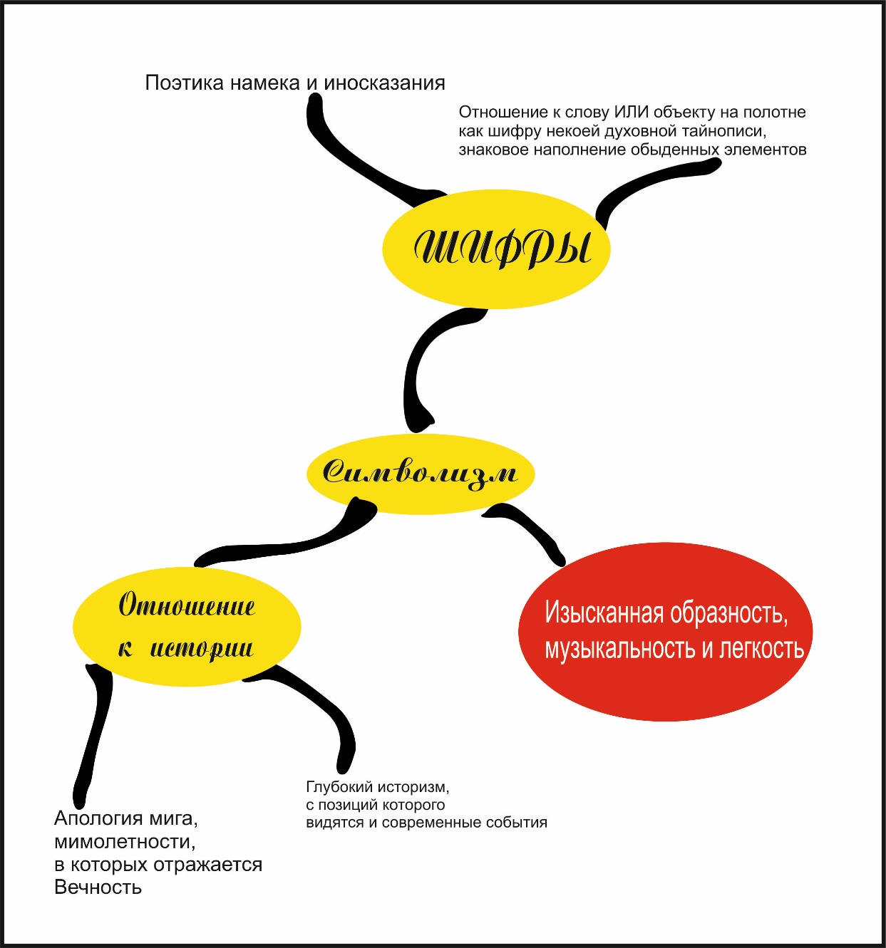 Учитель:«Как видите, в анализе литературного произведения и живописи много схожего, поэтому, сопоставив получившиеся у вас данные по характеристике двух произведений, вы сможете выявить отличительные черты модернистского течения, которое вам было предложено для анализа, узнать его и составить мейн-карту».
