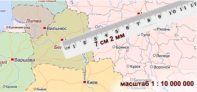 Ребята, перед вами карта. Как вы думаете, как найти расстояние между городами? И что означают отношение 1/10000000?