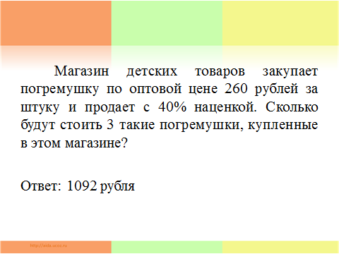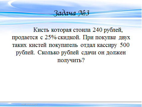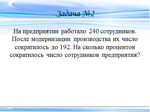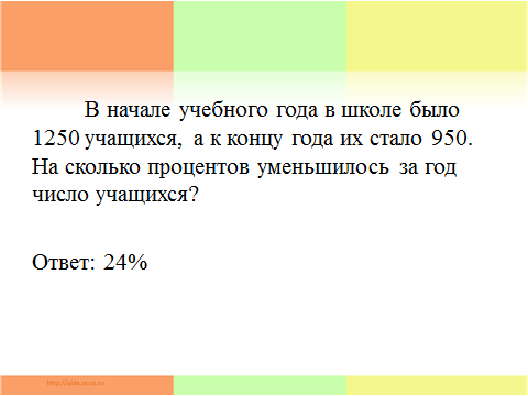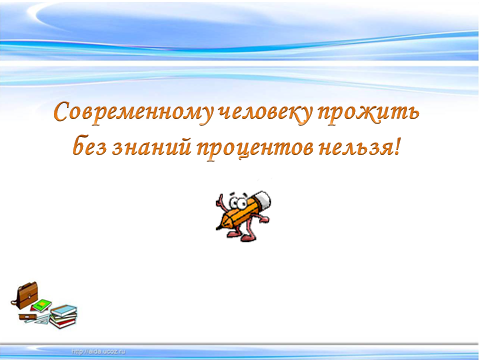| - Будем говорить о процентах. (рассуждения детей) Каждому человеку постоянно приходится иметь в жизни дело с процентами. - В школе много задач на проценты. - Проценты используются при подсчёте качества знаний по предмету. - Знания процентов необходимы и для выборов в Государственную думу, подсчёта роста числа рождаемости и т. д. - Граждане пользуются услугами банков для взятия кредитов, и им приходится рассчитывать проценты по кредитам. - Скидки в магазинах. Проценты в нашей жизни проникли практически во все отрасли. Также умение решать задачи на проценты понадобится прежде всего при сдаче ГИА и ЕГЭ. - нет, не можем! | ||||||