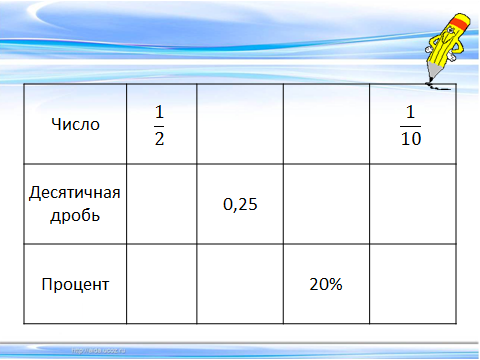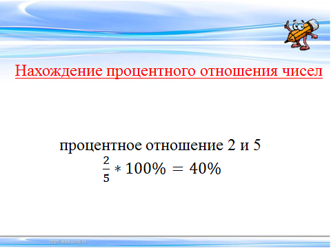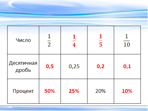 !- предлагаю вам памятки для ознакомления «Основные сокращенные процентные отношения, различные обозначения». | Записать в тетради тему урока «Проценты. Решение задач на проценты». (записать со слайда) | ||||||