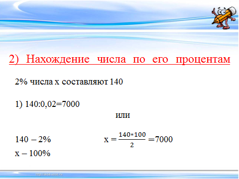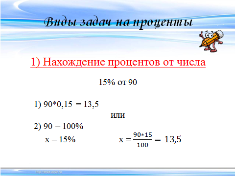 - Вспомним виды задач на проценты. (открыть вид задач, а дети должны прокомментировать правило)